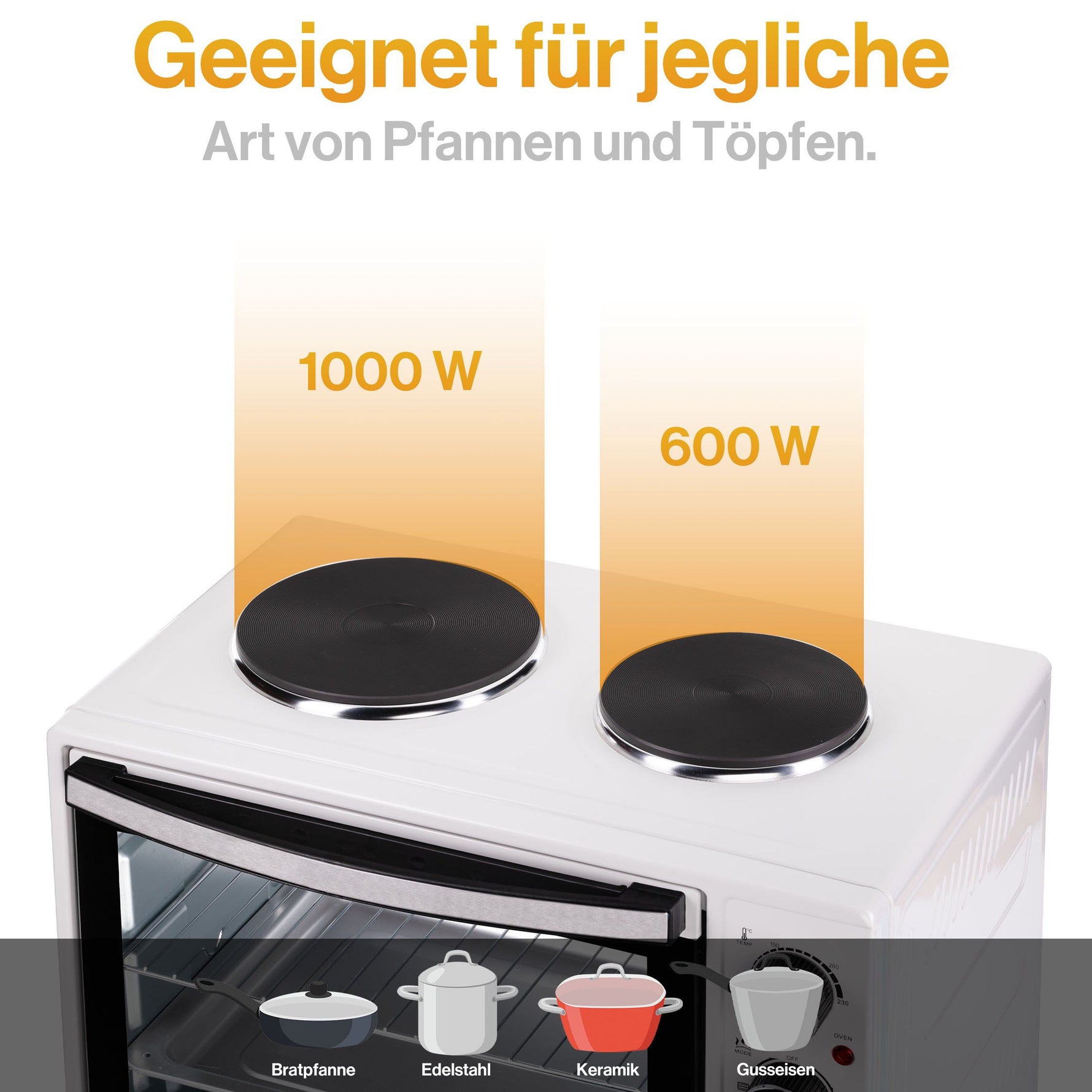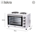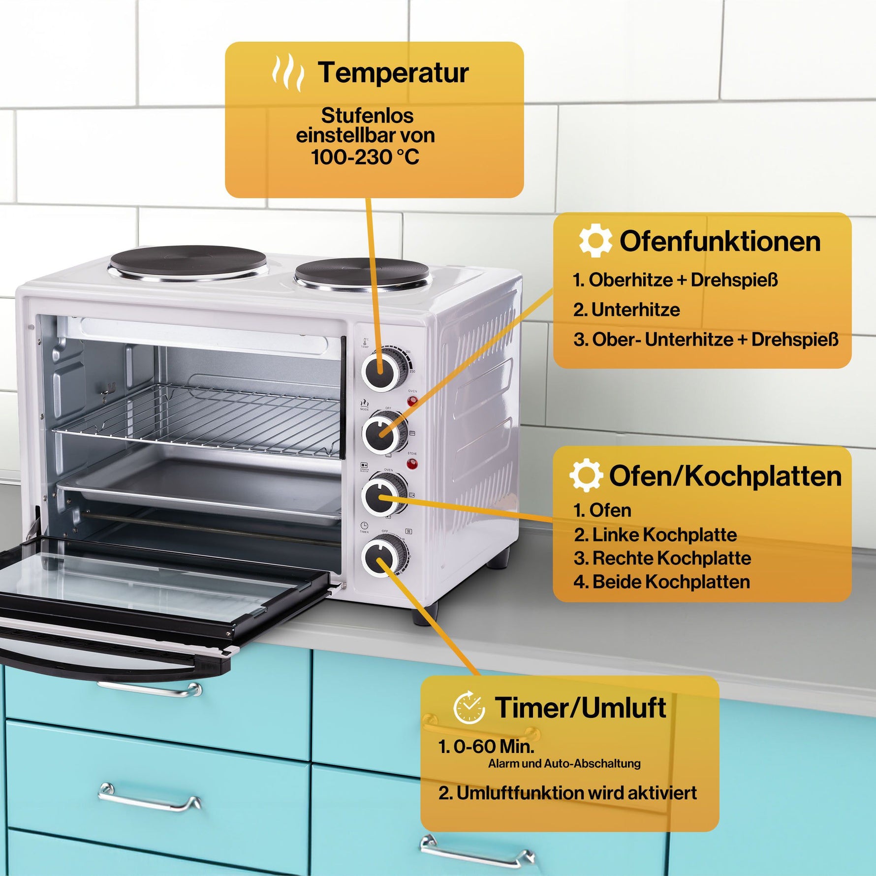Der multifunktionale Mini-Backofen von Iskra mit 38 L Volumen und 3600 W Gesamtleistung ist dein All-in-One-Küchengerät. Zwei Kochplatten (1000 W & 600 W), Umluft, Grillspieß und Ober-/Unterhitze ermöglichen flexible Zubereitung verschiedenster Gerichte.