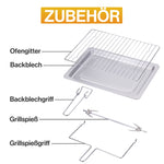 Einstellbar bis 230 °C, mit Timer und langlebigen Heizelementen aus Edelstahl. Ideal für kleine Küchen, Ferienwohnungen oder den Campingplatz. Inklusive Backblech, Rost und Spieß – kompakt, leistungsstark, vielseitig.