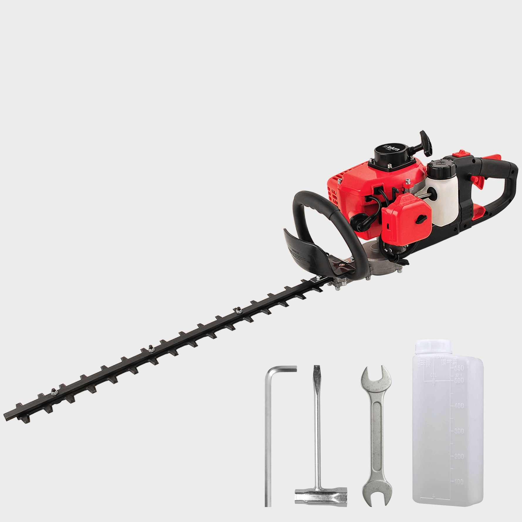Iskra Benzin Heckenschere, Mischbehälter, Imbus, Zündkerzenschlüssel, Schraubenschlüssel