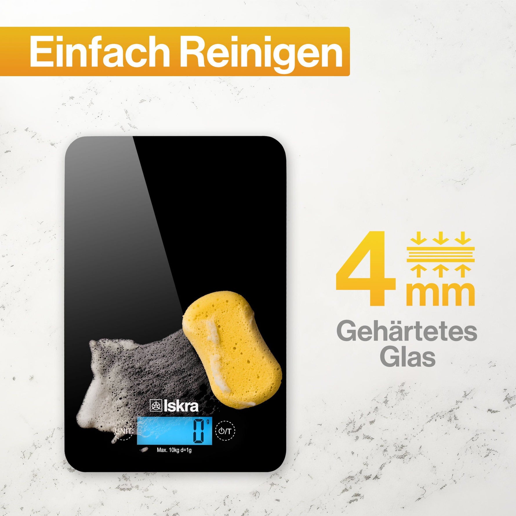 Die elegante Wiegefläche aus gehärtetem Glas ist nicht nur ein Hingucker, sondern auch besonders leicht zu reinigen. Dank der intuitiven Touch-Bedienung, der Tara-Zuwiegefunktion und dem gut ablesbaren LCD-Display wird das Abwiegen zum Kinderspiel.