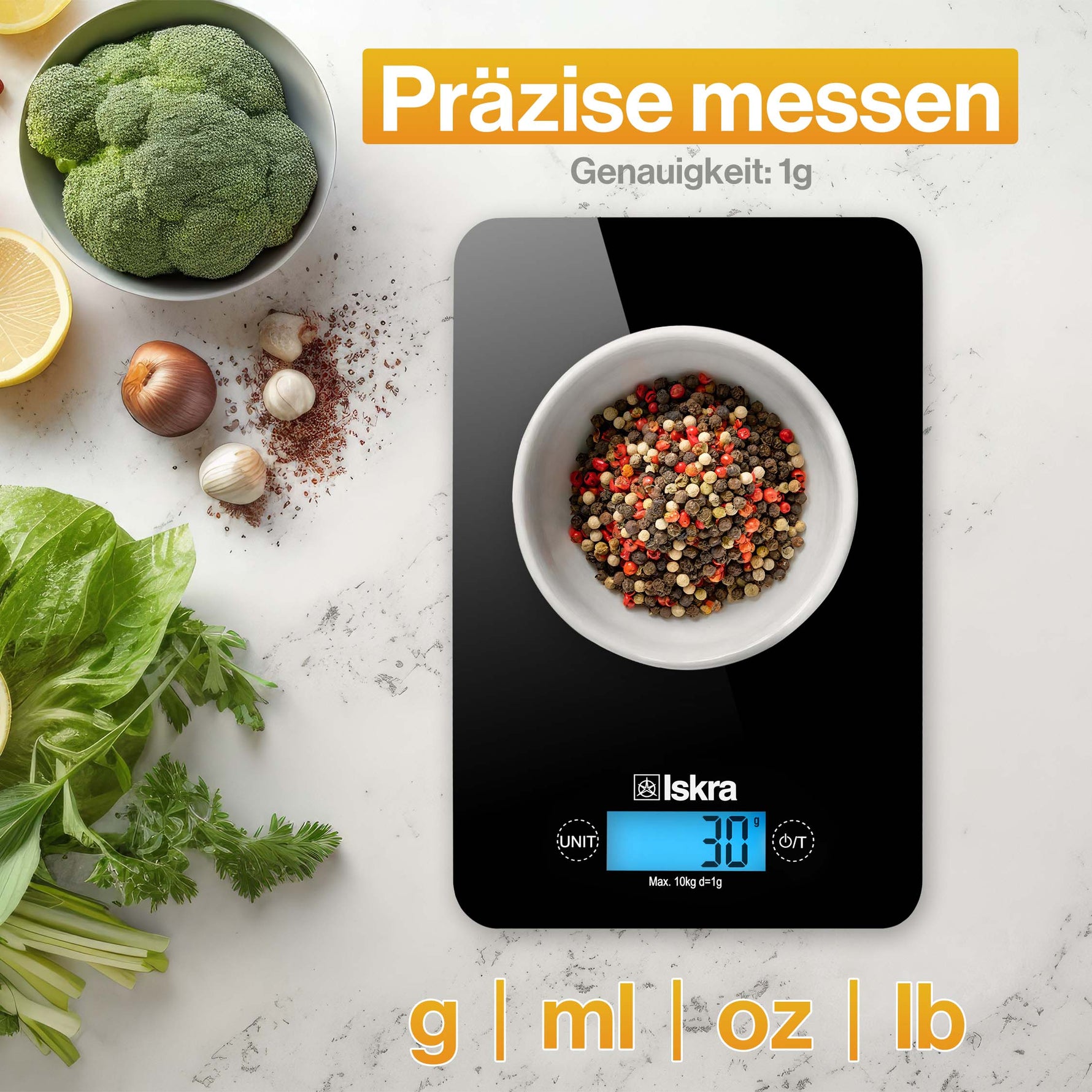 Präzision trifft Design in Ihrer Küche! Diese digitale Küchenwaage wiegt Zutaten von 1 Gramm bis zu 10 kg aufs Gramm genau – perfekt für exakte Rezepte beim Kochen und Backen.